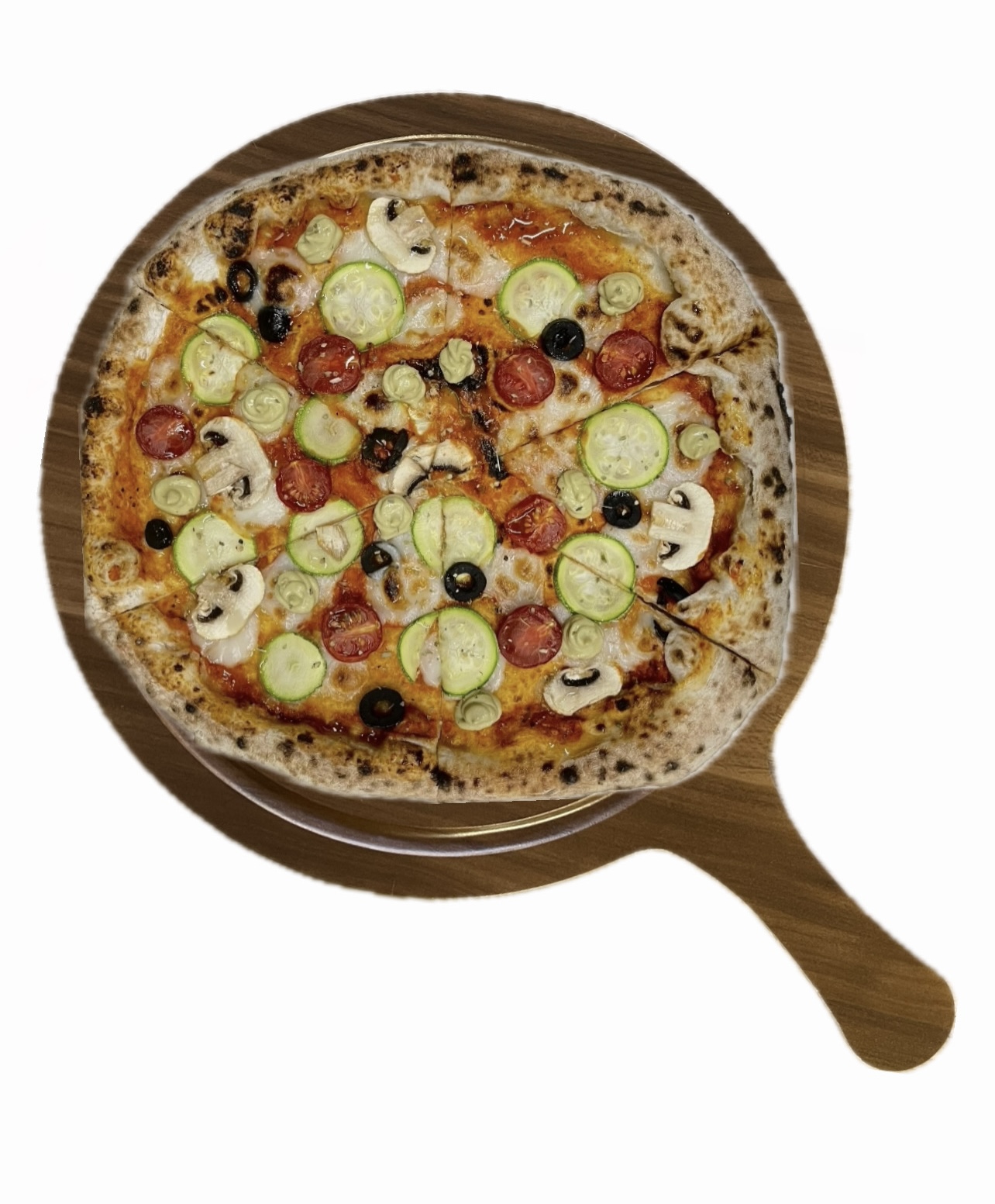 خمیر ناپولیتن-سس مخصوص مارینارا-پنیر موزارلا-کدو-قارچ-زیتون سیاه-پوره ی نخود فرنگی دست ساز-زیتون آروماتیک